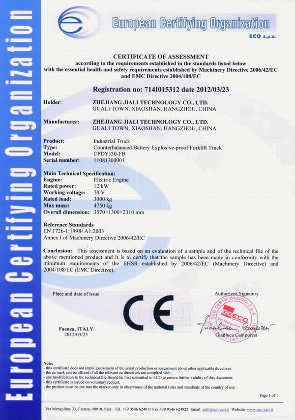 浙江佳力科技股份有限公司生產(chǎn)的全液壓防爆交流電動叉車近日獲得歐洲CE認證,為公司開拓歐美市場打下基礎(chǔ)。佳力公司是一家致力于研發(fā)、生產(chǎn)、銷售防爆叉車的專業(yè)廠家,為客戶提供安全、可靠、高效的防爆叉車是公司一直努力的方向 。