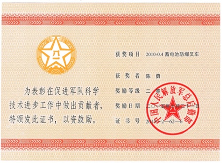 近日,浙江佳力科技股份有限公司與總后勤部建筑工程研究所共同開(kāi)發(fā)研制的 “2010-0.4蓄電池防爆叉車(chē)”項(xiàng)目,榮獲軍隊(duì)科技進(jìn)步獎(jiǎng)二等獎(jiǎng)。我公司總工程師陳勇以項(xiàng)目負(fù)責(zé)人之一的身份,加入該項(xiàng)目研制的項(xiàng)目組,成為重要的項(xiàng)目完成者之一,榮獲軍隊(duì)科學(xué)技術(shù)進(jìn)步獎(jiǎng)二等獎(jiǎng)。